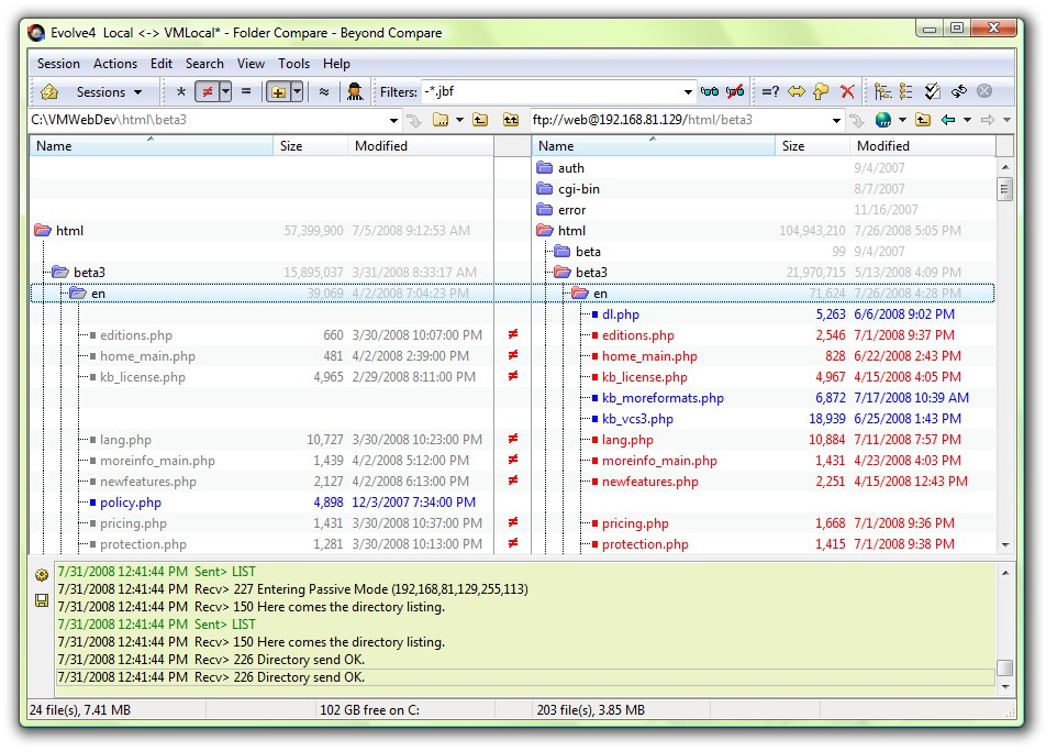 Se puede comparar tanto unidades como carpetas a alta velocidad, comprobar sólo tamaños o veces que se han modificado. O bien verificar cada archivo comparando a nivel de byte por byte. También los sitios FTP y archivos zip se gestionan perfectamente, así que puedes actualizar tu web con solo hacer un clic.