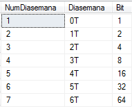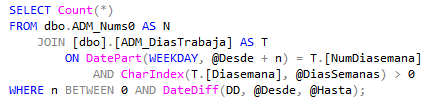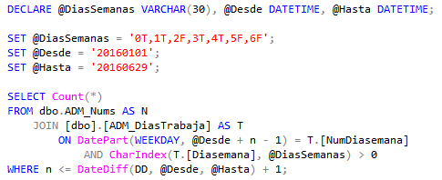 Vemos que hay una correspondencia con la configuración del servidor SQL Server donde el primer día de la semana es el lunes con identificador 1, y el formato heredado donde dicho día es 0T –si trabaja o 0F si no–. Bueno, la pregunta que resuelve la función donde está este código es cuántos días va a trabajar entre dos fechas y esta tabla auxiliar nos permite emplear una consulta SQL en vez de un cursor. SQL en estado puro.