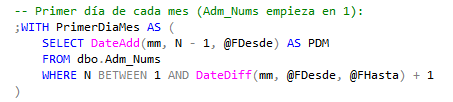 Si necesitamos el primer día del mes en un rango de meses, una vez calculado el primero, es muy fácil hacerlo con una tabla de números. En este caso vemos que, sí se usa el rango, por lo que estamos protegidos de posibles cambios en la tabla, pero la tabla empieza en 1, por lo que hay que tenerlo en cuenta en la consulta y poner una nota: