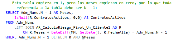 En esta consulta observamos una forma de sortear el hecho de que no haya cero en la tabla: necesitamos los meses desde el actual hasta el año que viene más uno –trece meses– para lo que usamos directamente N – 1 en todas partes: