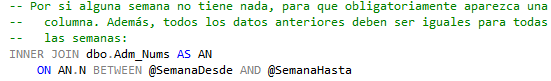 Cuando usamos la tabla de números para procesar un rango de fechas, lo normal es que queramos empezar en el primer día inclusive. Como dichas tablas en la literatura generalmente empiezan con el 1, nos toca emplear un código complejo que además tenemos que comentar. Por ejemplo, si tenemos unos contratos con día inicio, día fin y un campo que refleja los días que trabaja durante la semana, con una tabla de números «normal» tendríamos: