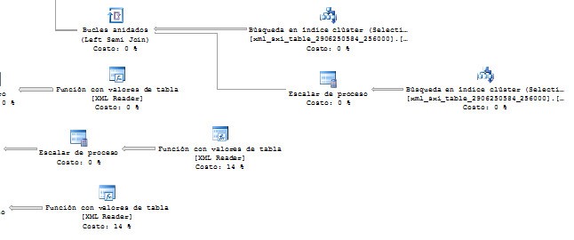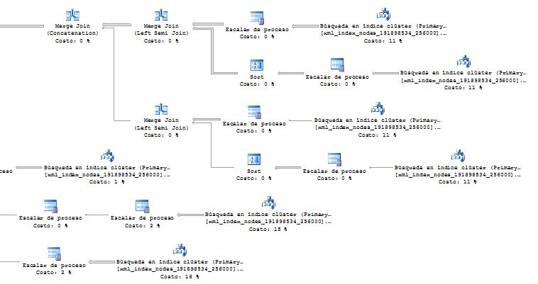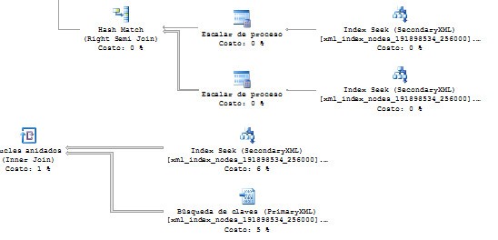 Podríamos pensar que este índice no está completo, pero la realidad es que hay de sobra. Porque en los consejos que nos da la documentación de SQL Server no he visto que refiera este caso donde tenemos una lista en nodes() y en este caso sólo utiliza el índice filtrado para los dos CROSS JOIN nodes(), pero no para buscar los valores: